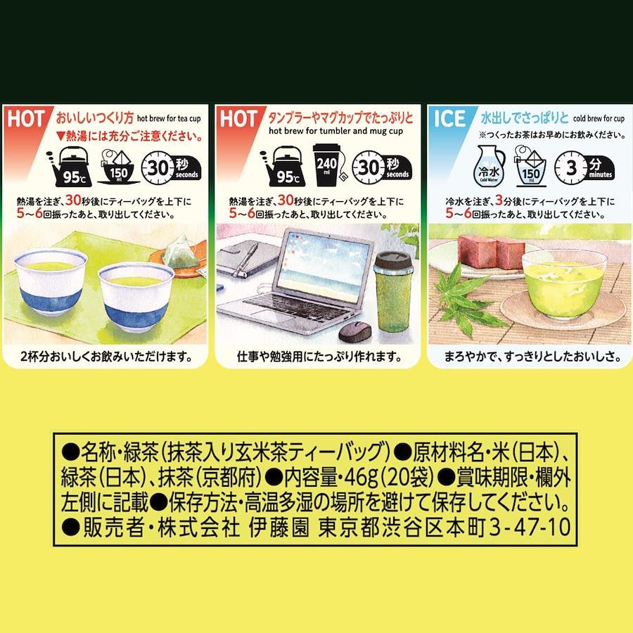 高温多湿の場所を避けて保存してください。内容量:2.3g×20袋原材料:?米(日本)、緑茶(日本)、抹茶(京都府)アレルゲン:無し容器:ティーバッグマグカップにお湯を注いでティーバッグをポンっと入れるだけ。急須で入れた味わいが手軽に楽しめる日本茶ティーバッグです。【免責事項】メーカーによる商品リニューアルに伴いパッケージ(内容量も含む)変更が行われた場合、新パッケージでお届け致します事ご了承願います。