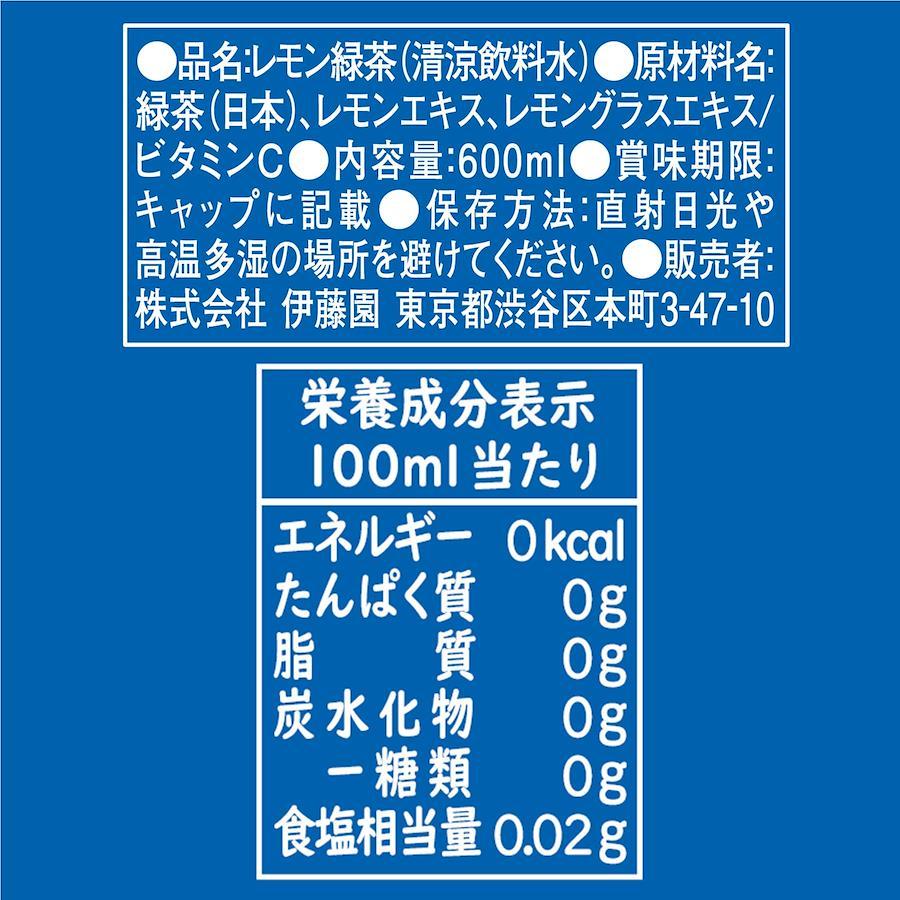 内容量:600ml×24本容器:ペットボトル原材料:緑茶(日本)、レモンエキス、レモングラスエキス/ビタミンC栄養成分(100ml当たり):エネルギー:0kcal、たんぱく質:0g、脂質:0g、炭水化物:0g(糖類:0g)、食塩相当量:0.02gアレルゲン:無し【免責事項】メーカーによる商品リニューアルに伴いパッケージ(内容量も含む)変更が行われた場合、新パッケージでお届け致します事ご了承願います。