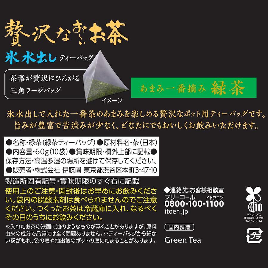 ●旨みが豊富な一番茶を100%使用。●茶葉を通常の2倍使用(※)しているため、緑茶の旨みをよりお楽しみいただけます。(※当社比)●茶葉が贅沢にひろがる、三角ラージバッグを使用。●冷水にティーバッグを入れるだけ、約2時間で贅沢な味わいが出来上がり。●自分へのご褒美に、少し贅沢なお茶はいかがでしょうか。