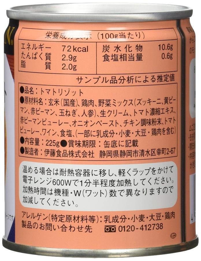 6種類の彩り豊かな野菜と鶏肉の旨味をぎゅっと1缶に閉じ込めたトマトリゾット缶です。隠し味に生クリームを加えることでコク深く優しい味わいに仕上げました。常温でももちろん、軽く加熱したり、トッピングを加えたりすることでより美味しくお召し上がり頂けます。国内自社工場製造です。100g当たりエネルギー72kcal、たんぱく質2.9g、脂質2.0g、炭水化物10.6g、食塩相当量0.6g