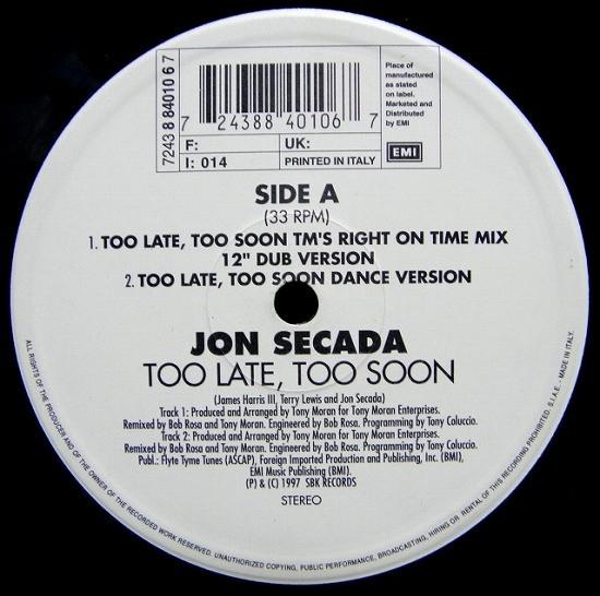 ・アーティストJon Secada・タイトルToo Late, Too Soon・レーベル・型番EMI 724388401067・フォーマット12インチレコード・コンディション(盤)良い (VG+)・コンディション(ジャケット)プレインカバー(元ジャケット/カバー無し)・コンディション(帯)オビなし・特記事項【盤に浅い跡】【カバーにリングウェア】