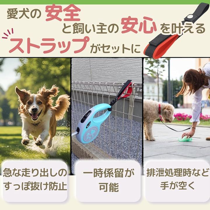 「様々なシーンをアシスト」リード長を変化させられるので、人の多いお散歩シーンは短く、広々とした公園等では長くしたりとさまざまなシーンで活躍します。