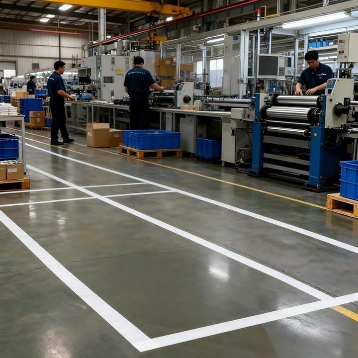 このホワイト テープは、工場やオフィス、店舗などのエリア表示にも適しており、簡単に床に貼り付けることができます。