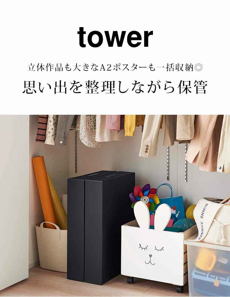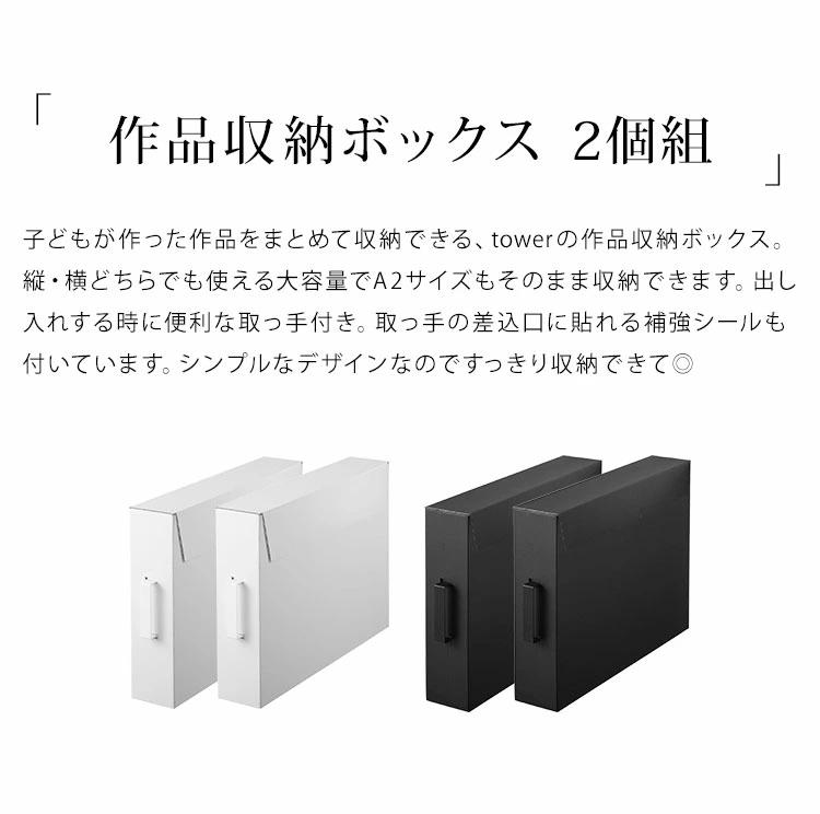 【作品収納ボックス 2個組】子どもが作った作品をまとめて収納できる、towerの作品収納ボックス。縦・横どちらでも使える大容量でa2サイズもそのまま収納できます。出し入れする時に便利な取っ手付き。取っ手の差込口に貼れる補強シールも付いています。シンプルなデザインなのですっきり収納できて◎