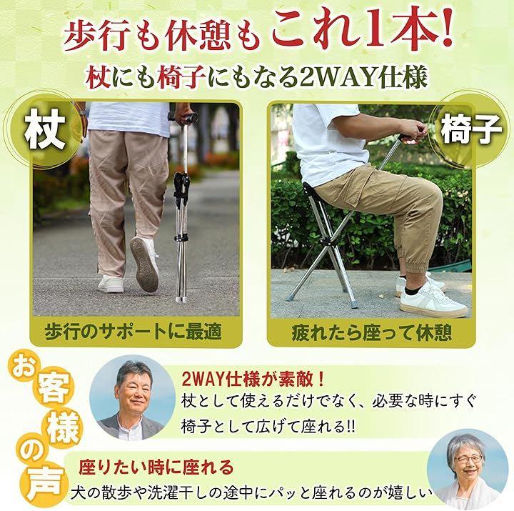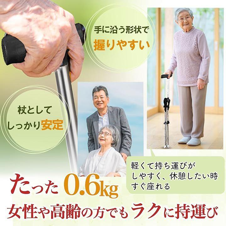 立って歩くときは安定感ある杖として支え、疲れたときにはすぐに座って休むことができます。