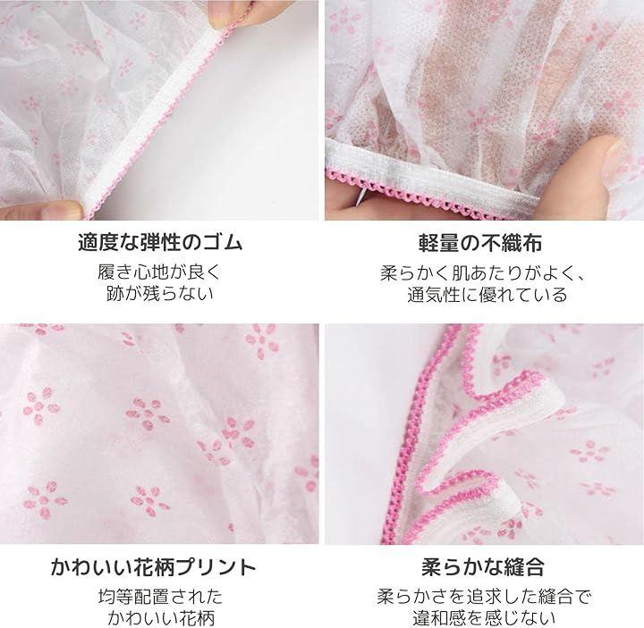 「適度な弾性のゴム」履き心地が良く跡が残りません/「軽量の不織布」柔らかく肌あたりがよく、通気性に優れています/「かわいい花柄プリント」均等配置されたかわいい花柄/「柔らかな縫合」柔らかさを追求した縫合で違和感を感じない