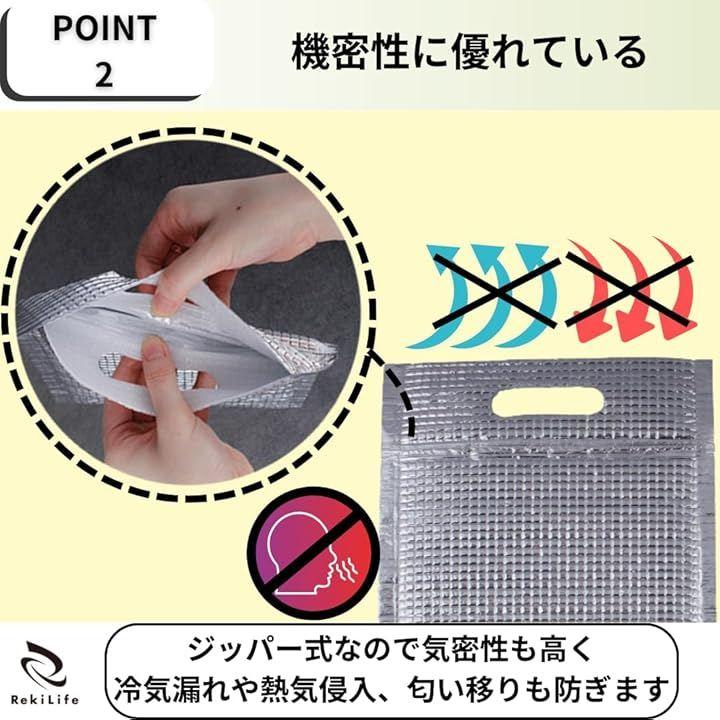「機密性に優れている」ジッパー式なので気密性にも優れており匂い移りも防ぎ、保冷剤と組み合わせて使うとより断熱効果を持続します。