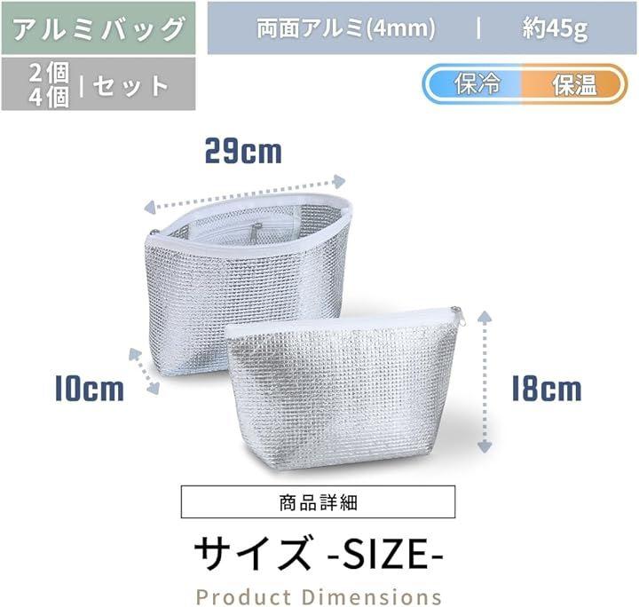 「商品内容」保冷バッグ:2個 サイズ:全長29cm、高さ18cm、マチ10cm、厚み4mm 材質:両面アルミ生地(PET、PE) 重量:45g *サイズ詳細は商品画像をご確認ください。