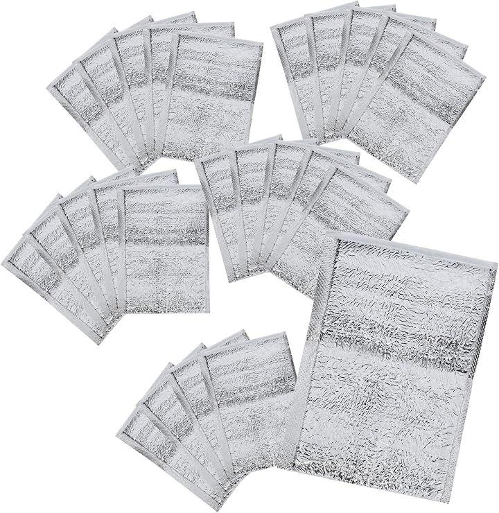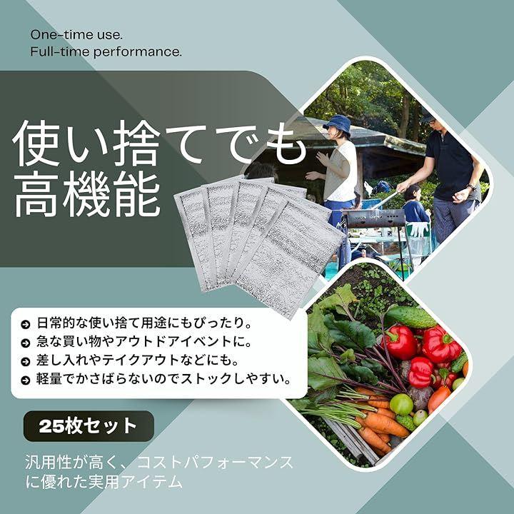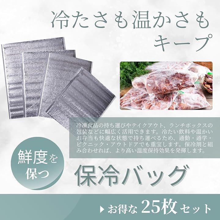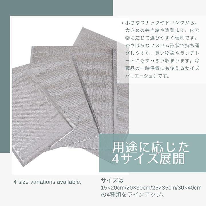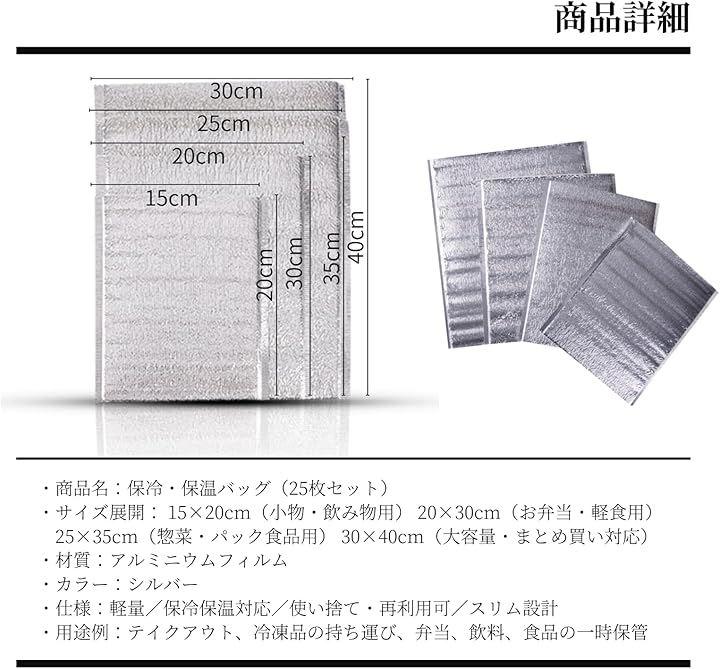 「商品詳細」 ・商品名:保冷・保温バッグ(25枚セット) ・サイズ展開: 15x20cm(小物・飲み物用) 20x30cm(お弁当・軽食用) 25x35cm(惣菜・パック食品用) 30x40cm(大容量・まとめ買い対応) ・材質:アルミニウムフィルム ・カラー:シルバー ・仕様:軽量/保冷保温対応/使い捨て・再利用可/スリム設計 ・用途例:テイクアウト、冷凍品の持ち運び、弁当、飲料、食品の一時保管