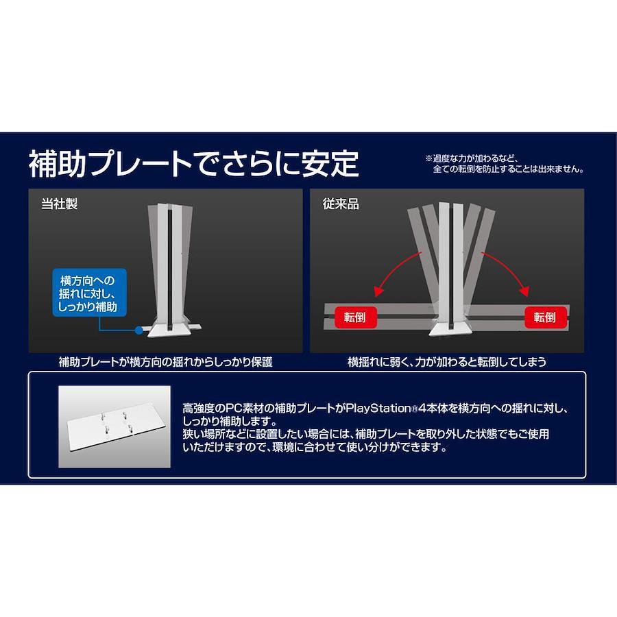 ・PlayStation (R) 4 グレイシャー・ホワイト500GB (CUH-1100AB02) に最適な、倒れにくい縦置きスタンドのホワイト版です。 ・横揺れに強い補助プレート付属。狭い場所では外して使用するなどお好みに合わせて使い分けができます。 補助プレート無しでも安定性が高い為、安心して縦置きにする事が可能です。 ・USB端子用キャップ2個、AUXキャップ1個付属で端子部へのホコリ侵入を防止します。