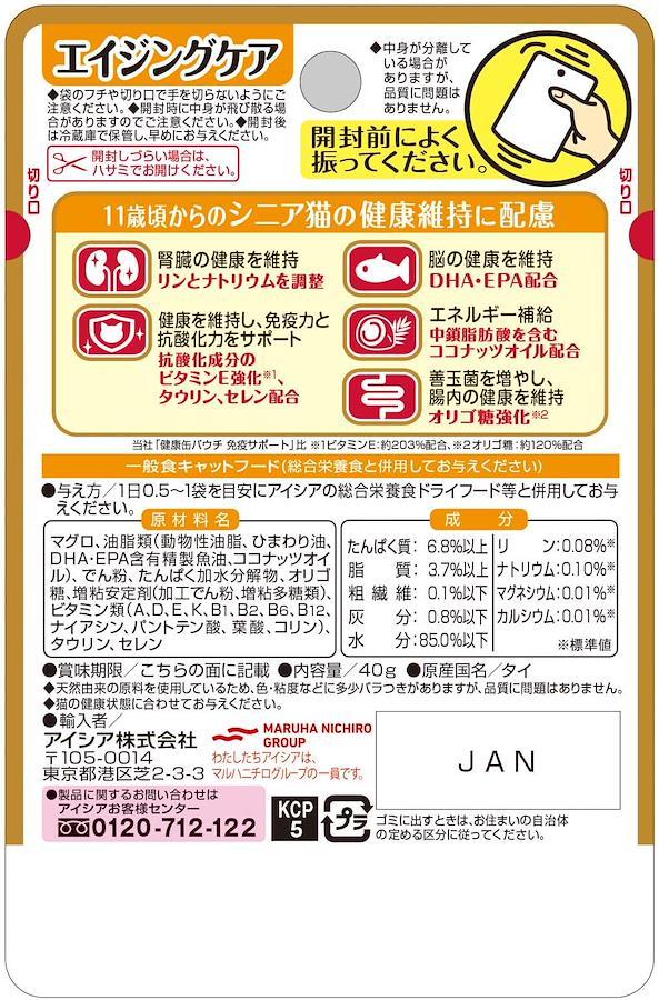 :本体サイズ(幅X奥行X高さ):8.5×2×13cm/本体重量:45g/原産国:タイ/栄養成分:粗たんぱく質:6.8%以上、粗脂肪:4.3%以上、粗繊維:0.1%以下、粗灰分:0.8%以下、水分:83.0%以下、エネルギー:39kcal/シニア猫の腎臓の健康維持に配慮したレトルトパウチ/11歳ころからのシニア猫の腎臓の健康維持に配慮しリンとナトリウムを調整/タウリン、セレンを配合して健康の維持と免疫力・抗酸化力をサポート/商品リニューアル等により、パッケージ画像は予告なく変更されることがあります。お届けの商品と異なる場合がございますのでご了承ください。