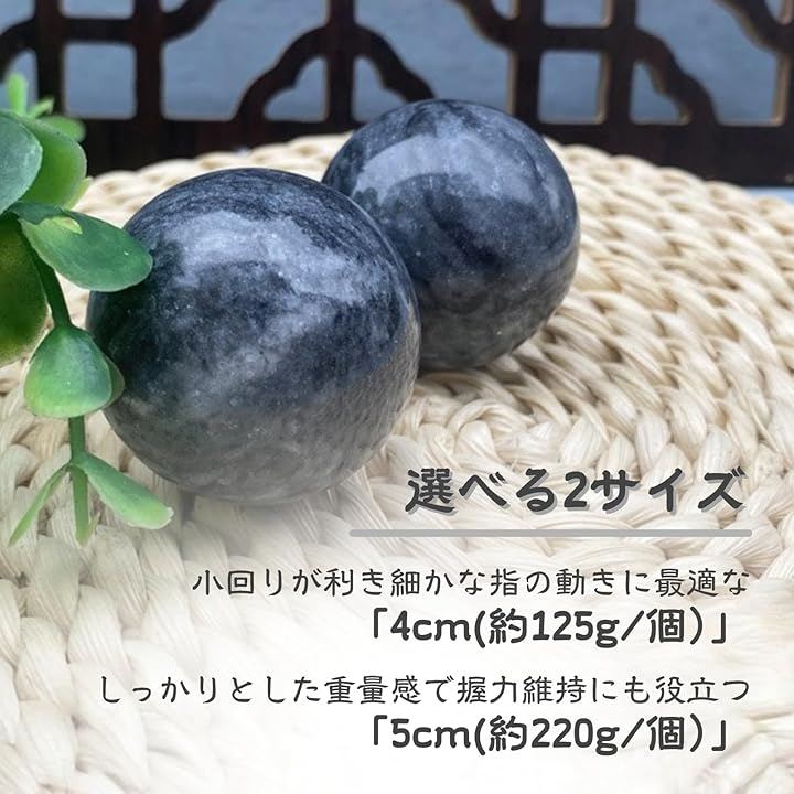 小回りが利き細かな指の動きに最適な「4cm(約125g/個)」と、しっかりとした重量感で握力維持にも役立つ「5cm(約220g/個)」から、目的に合わせてお選びいただけます。