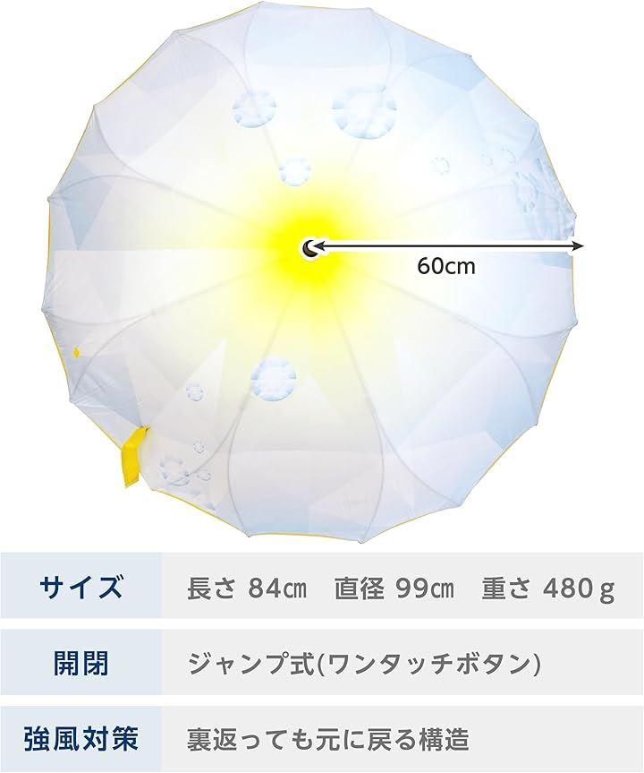 [商品スペック]生地:ポリエステル100% / 骨組:グラスファイバー(16本) / 全長:84cm/開いた直径:99cm/布地の半径:60cm/重量:480g / 先端(石突き):スベり止め強力ゴム/留めベルト:面ファスナー/ 生地:260T/撥水性:4等級/紫外線対策:UVカット98%・UPF50+ / カラー:全15色 / タイプ:ジャンプ傘