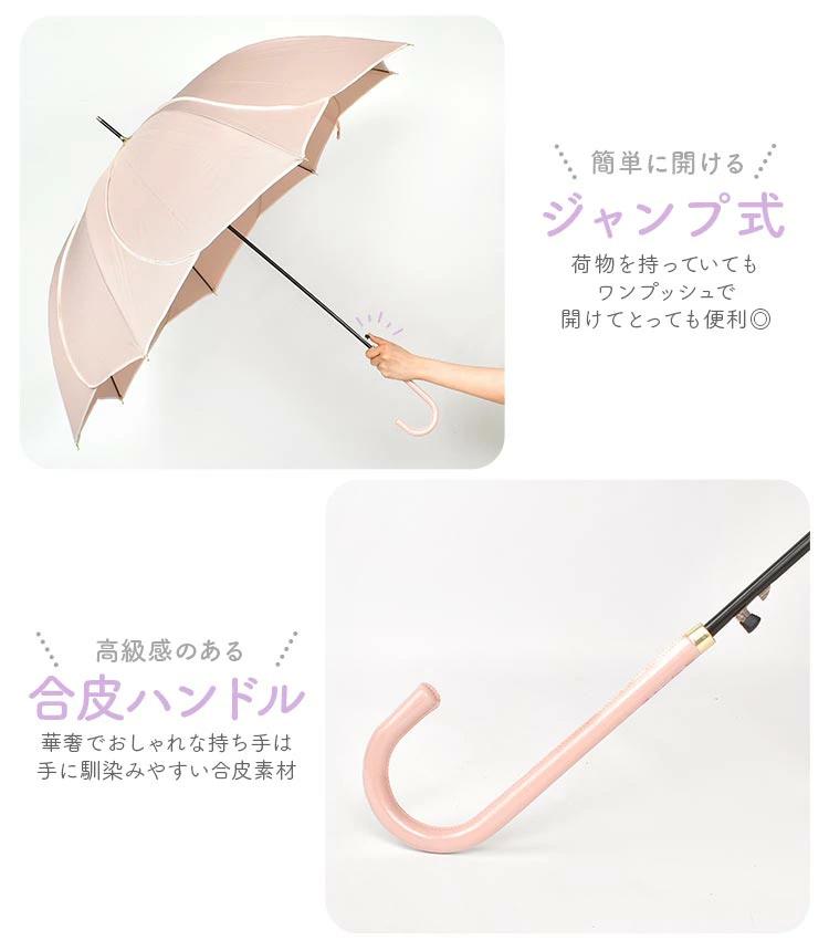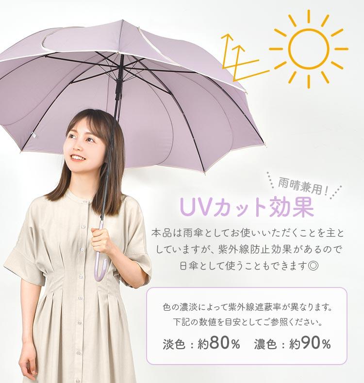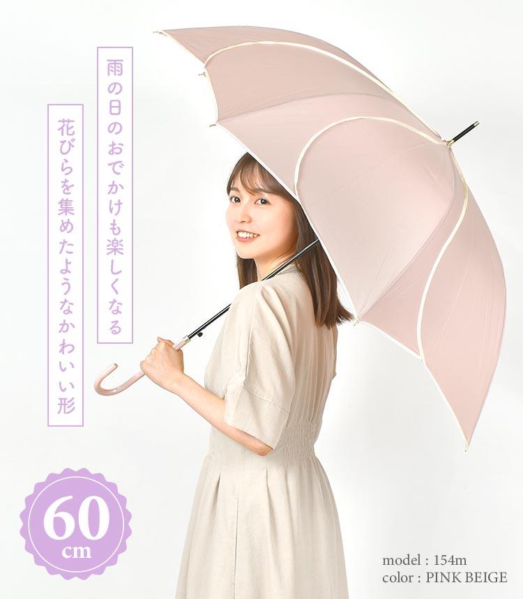 【フレラ 長傘 60cm】雨の日でも気分が上がる花びら型の長傘。落ち着いたくすみカラーはカジュアルにもフェミニンな雰囲気にもぴったりです。ワンタッチで開ける便利なジャンプ傘で、親骨には軽くて丈夫なグラスファイバー骨を使用。UVカット効果もあるので日傘としての使用もできます◎キッズ用もあるので親子で揃えて使うのもおすすめです。