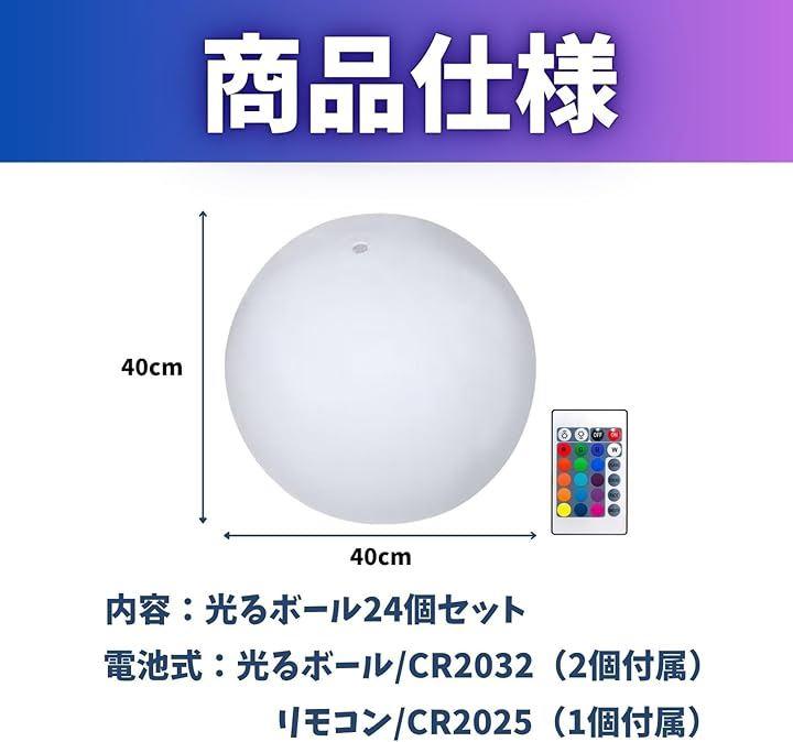 「光るボール 仕様」 内容:光るボール24個セット サイズ:直径40cm 電池式:光るボール/CR2032(2個付属)、リモコン/CR2025(1個付属)*リモコン4個付属