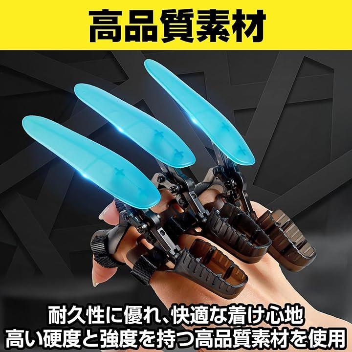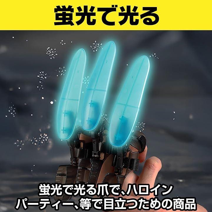 「個性的で光る爪の演出」 この「光る爪 飛び出す爪」は、蛍光の輝きが夜間のイベントやパーティーで注目を集めること間違いなし。爪は格納式で、安全に収納したり飛び出させたりすることが可能です。