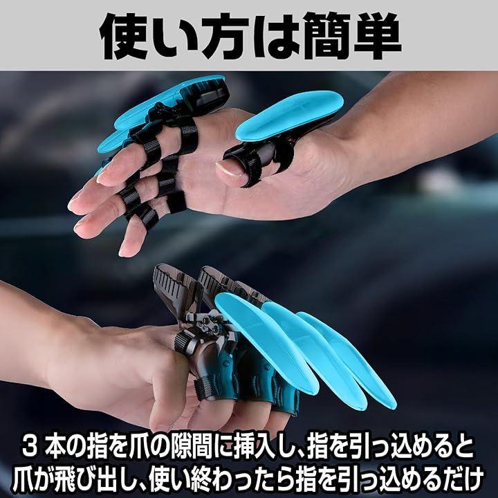 「個性的で光る爪の演出」 この「光る爪 飛び出す爪」は、蛍光の輝きが夜間のイベントやパーティーで注目を集めること間違いなし。爪は格納式で、安全に収納したり飛び出させたりすることが可能です。