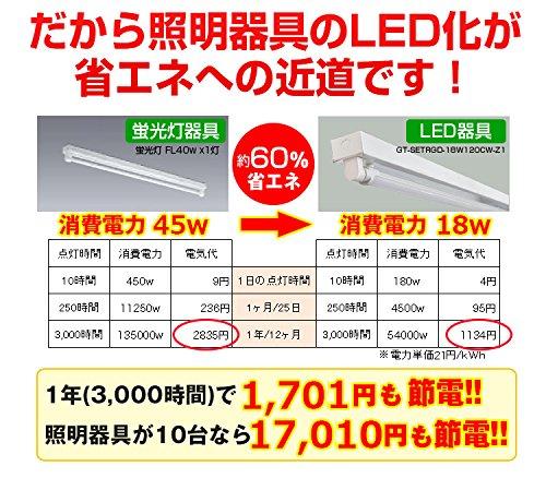 【セット】:LED直管蛍光灯18W x 1pcs トラフ40W型1灯器具 x 1pcs【LED蛍光灯仕様】:口金:G13(蛍光灯タイプ) 電圧:85V~250V ・周波数50/60Hz・消費電力:18W 全光束:2100lm・色温度:昼光色(6500K)・ビーム角:180度 材質:ポリカーボネイト+アルミ・寸法:φ32mm×L1198mm・重量:225g【トラフ器具仕様】:本体:鋼板・白色仕上 反射板:鋼板・白色仕上(高反射白色粉体塗装) 質量:1.3kg 鋼板厚さ:SPCC冷延鋼板(1mm) サイズ:1260×100×90mm 口金:G13給電方式:両側給電 AC100V/200V対応可能 電源端子台付き PSE認証取得済(電気用品安全法)電源内蔵型LED専用照明器具 両側給電仕様※安定器が付いていないため従来の蛍光灯はご使用いただけません。※100V/200V配線を取り扱う場合は、有資格者による配線工事を行うようお願いします。