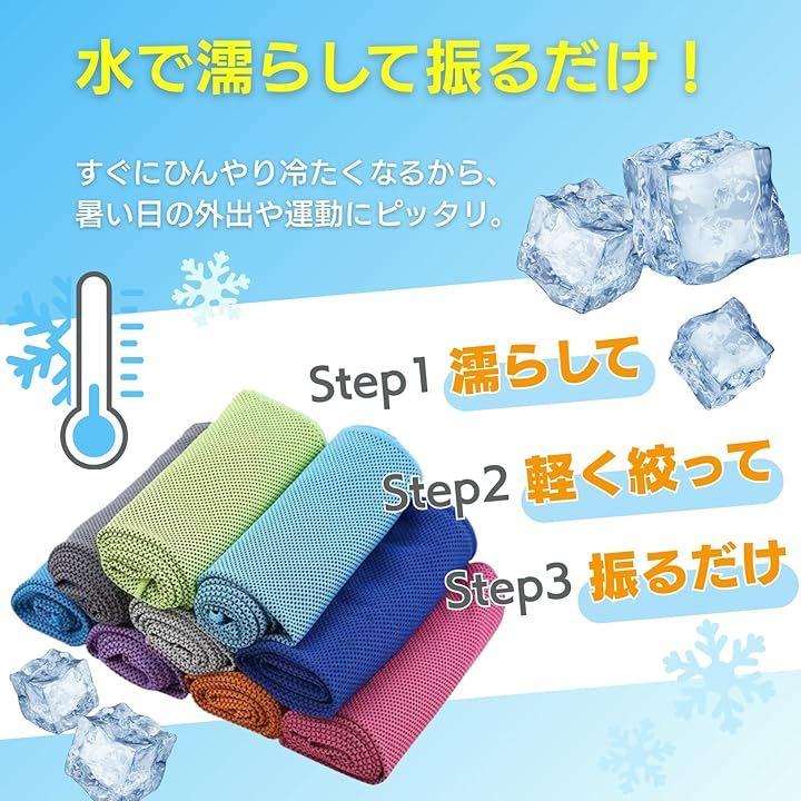 「水だけでひんやり冷感」 水に濡らして絞って振るだけ。すぐに冷たくなるから、屋外活動や運動中のリフレッシュに最適です。