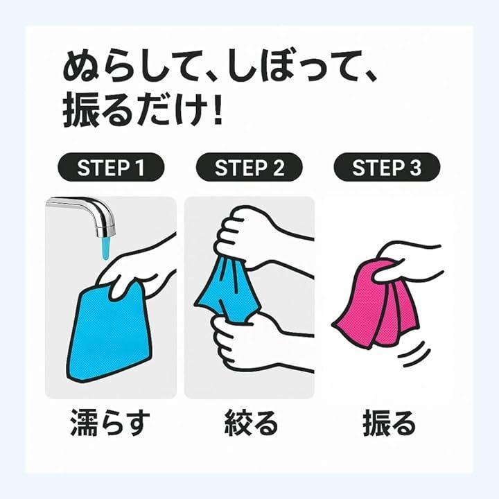 「濡らして振るだけ。瞬間冷感」水に濡らして軽く絞り、数回振るだけでひんやり冷感が復活。