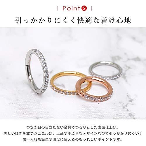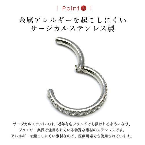 ゲージ:14G・16G/カラー:シルバー・ゴールド・ピンクゴールド有効軸長:約8mm・約10mmモチーフの素材:サージカルステンレス(シルバー以外のカラーはサージカルステンレスの上にメッキコーティングを施しています。)ボディピアス・軟骨用ピアスとしてパーティーシーンにもぴったりの、見た目の美しさと使いやすさを兼ね備えたジュエル付きのリングピアスです。サージカルステンレスなのでつけっぱなしにしたい方にもおすすめです。おすすめ部位:イヤーロブ・ヘリックス・トラガス・アンチトラガス・オービタル・ダイス・ロック・アイブロウ・リップ(口ピアス)・マディソン・ヴァンパイア・タンウェブ・アンチスクランパー・ユブラ