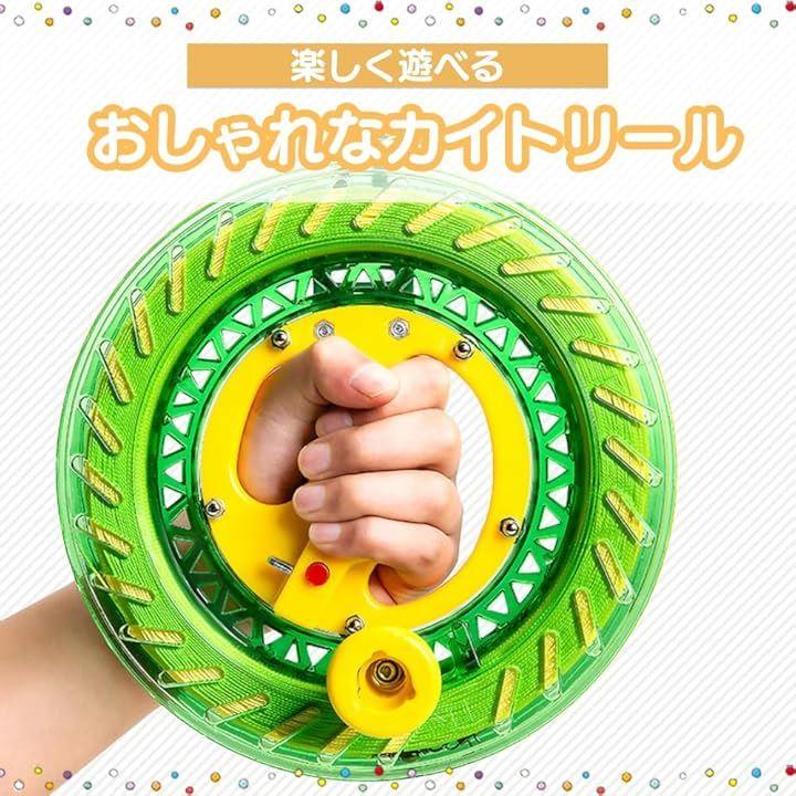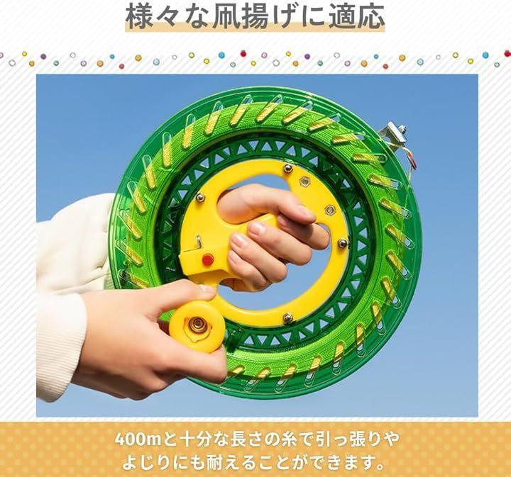 「おしゃれなカイトリール」400mと十分な長さの糸で引っ張りやよじりにも耐えることができ、小型凧から中型凧まで一般的な凧の多くに対応しています。