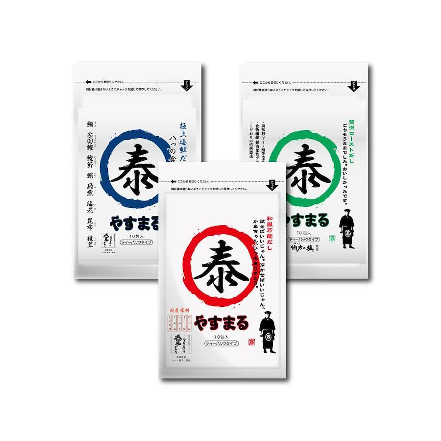 やすまるだし二枚看板の一つ、『和風万能だし やすまる(30包入り)』。 ティーパックを破って、焼きそば・焼き飯・野菜炒め・和風パスタの味付けにもご使用いただける便利な万能だしです。 本物のだしを是非お試しください! 賞味期限:約1年
