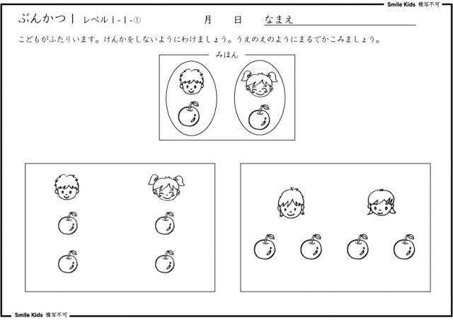 分ける知識は数量感覚を豊かにします。将来の割り算・かけ算・分数に繋がる感覚プリントです。トレーニングをすすめる中で工夫して解く方法を見つけだすことができます。できるだけ子どもの力でやり方を考えさせましょう。