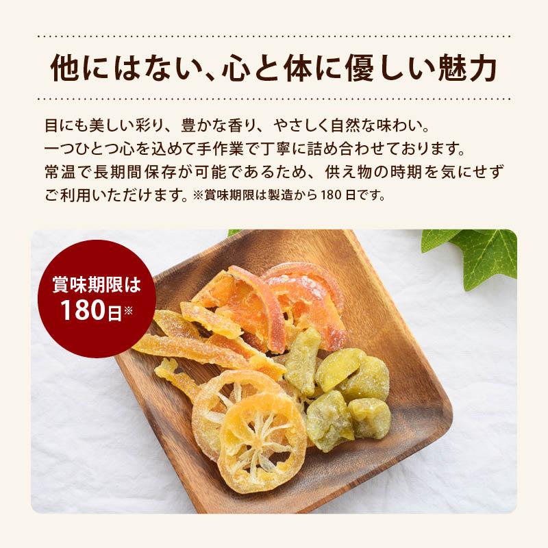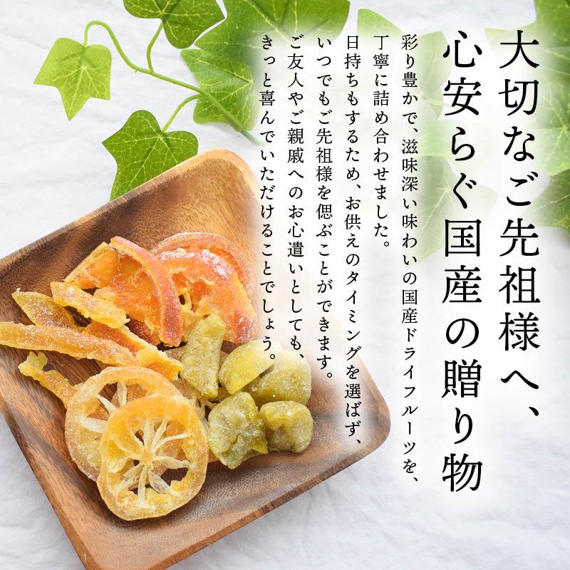 【大切なご先祖様へ、心安らぐ国産の贈り物】彩り豊かで、滋味深い味わいの国産ドライフルーツを、丁寧に詰め合わせました。日持ちもするため、お供えのタイミングを選ばず、いつでもご先祖様を偲ぶことができます。ご友人やご親戚へのお心遣いとしても、きっと喜んでいただけることでしょう。
