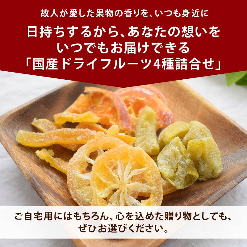 故人が愛した果物の香りを、いつも身近に。日持ちするから、あなたの想いをいつでもお届けできる「国産ドライフルーツ4種詰合せ」ご自宅用にはもちろん、心を込めた贈り物としても、ぜひお選びください。