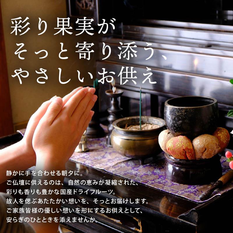 【彩り果実がそっと寄り添う、やさしいお供え】静かに手を合わせる朝夕に。ご仏壇に供えるのは、自然の恵みが凝縮された、彩りも香りも豊かな国産ドライフルーツ。故人を偲ぶあたたかい想いを、そっとお届けします。ご家族皆様の優しい想いを形にするお供えとして、安らぎのひとときを添えませんか。