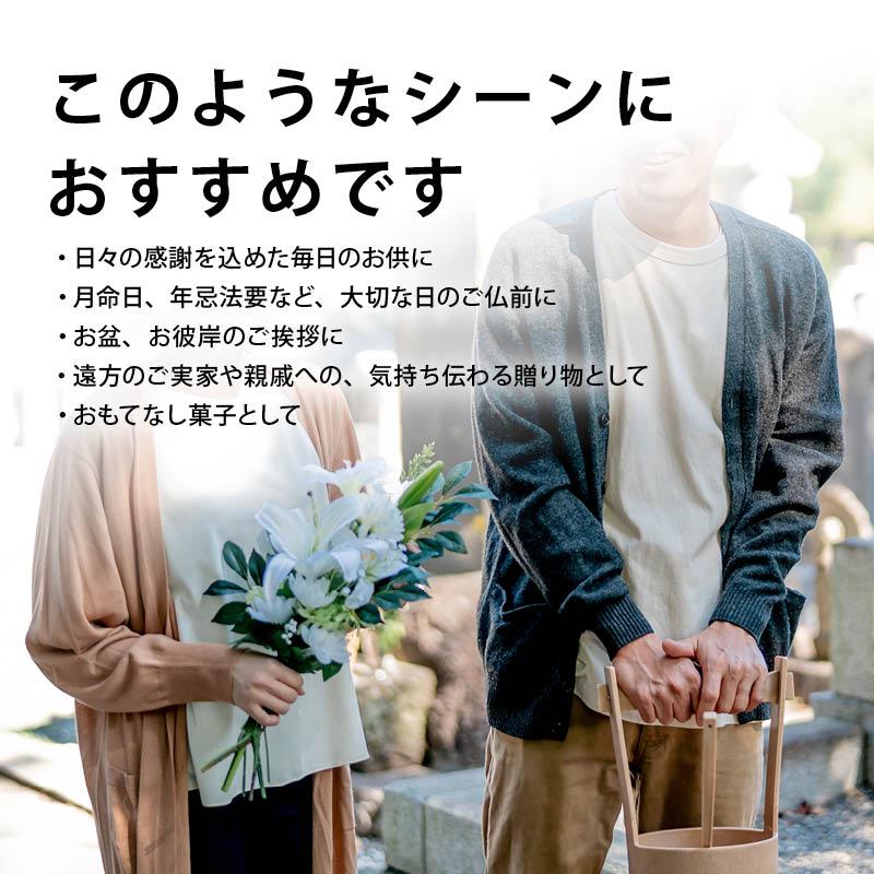 【このようなシーンにおすすめです】・日々の感謝を込めた毎日のお供に・月命日、年忌法要など、大切な日のご仏前に・お盆、お彼岸のご挨拶に・遠方のご実家や親戚への、気持ち伝わる贈り物として・おもてなし菓子として