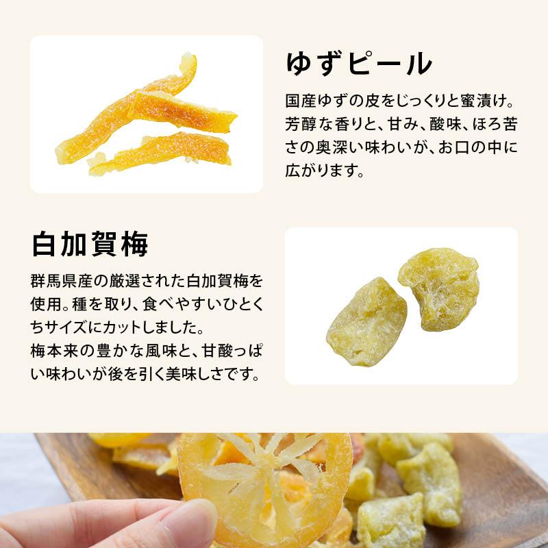 (4)白加賀梅群馬県産の厳選された白加賀梅を使用。種を取り、食べやすいひとくちサイズにカットしました。梅本来の豊かな風味と、甘酸っぱい味わいが後を引く美味しさです。