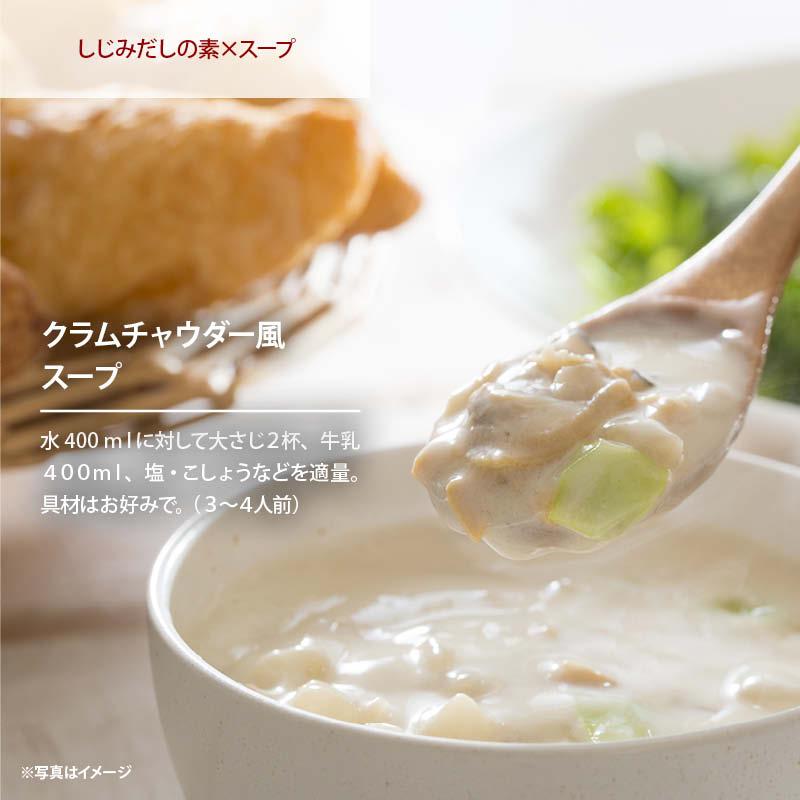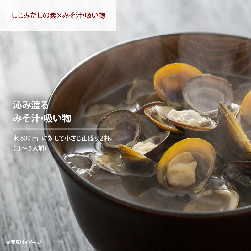 健康イメージの強いしじみを日常生活でも手軽に摂取、健康習慣!2019年に某TV番組でも有名アーティストが使用していることで、話題性も広がりました。風味豊かなしじみのだしの素。肝臓の働きを助けるオルニチンも100g中150入っており、この数字はしじみ約300個分に相当します。しじみだしの濃厚な旨味は料理の種類を問わず、みそ汁はもちろんのこと、洋風や中華など様々な料理に合います。さらに使い勝手が良いさっと溶ける顆粒タイプ。醤油とみりんを混ぜることで、何にでも合う特選しじみだし醤油など様々なアレンジもOK。開栓後は、お早めにお召し上がり下さい。
