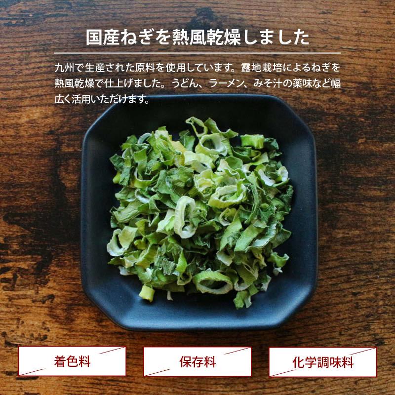 欲しい時に欲しい分だけ、簡単・便利で保存がきく乾燥野菜です。国産ねぎをじっくりと熱風乾燥させました。熱湯で3分以上、水で約10分以上戻すだけでご使用いただけます。戻さず、お味噌汁、スープなどに直接入れてもご使用いただけます。薬味のとして焼そばやラーメンなどのインスタント食品、アウトドア料理、時短メニューに包丁いらずでご利用いただけます。忙しい主婦や一人暮らしの方、常備菜や保存用、仕送りにもおすすめです。チャック付き袋です。