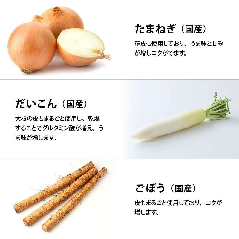 【国産野菜を余すところなく使用】1. しいたけ(福岡県北九州市産)アミノ酸の一種であるオルニチンがしじみの3倍もの含有量があり香りうま味があるのが特徴です。2. キャベツ(国産)甘みが特徴のキャベツを芯もまるごと使用しています。3. にんじん(国産)皮もまるごと使用し、カロテンも豊富です。まろやかなコクと甘みがうまれます。4. たまねぎ(国産)薄皮も使用しており、うま味と甘みが増しコクがでます。5. だいこん(国産)大根の皮もまるごと使用し、乾燥することでグルタミン酸が増え、うま味が増します。6. ごぼう(国産)皮もまるごと使用しており、コクが増します。
