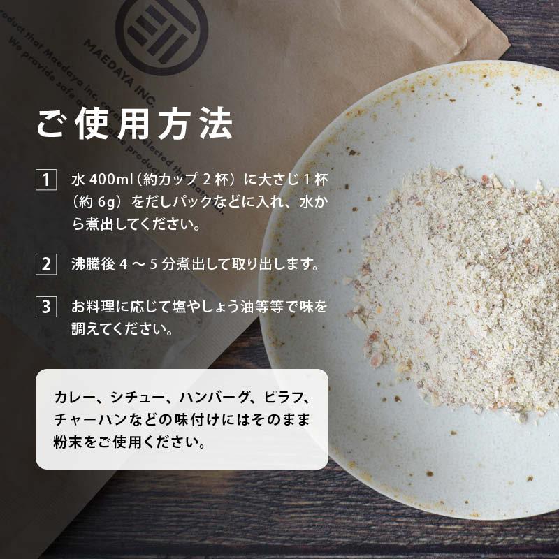 【ご使用方法】1 水130ccに小さじ1(約2g)をだしパックなどに入れ、水から煮出してください。2 沸騰後2~3分煮出して取り出します。3 お料理に応じて塩やしょう油等等で味を調えてください。みそ汁・煮物・うどん・鍋・離乳食にもご活用いただけます。カレー、シチュー、ハンバーグ、ピラフ、チャーハンなどの味付けにはそのまま粉末をご使用ください。