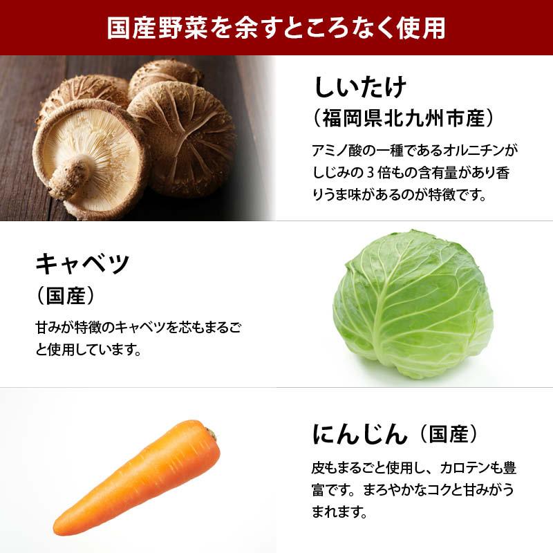 【国産野菜を余すところなく使用】1. しいたけ(福岡県北九州市産)アミノ酸の一種であるオルニチンがしじみの3倍もの含有量があり香りうま味があるのが特徴です。2. キャベツ(国産)甘みが特徴のキャベツを芯もまるごと使用しています。3. にんじん(国産)皮もまるごと使用し、カロテンも豊富です。まろやかなコクと甘みがうまれます。4. たまねぎ(国産)薄皮も使用しており、うま味と甘みが増しコクがでます。5. だいこん(国産)大根の皮もまるごと使用し、乾燥することでグルタミン酸が増え、うま味が増します。6. ごぼう(国産)皮もまるごと使用しており、コクが増します。