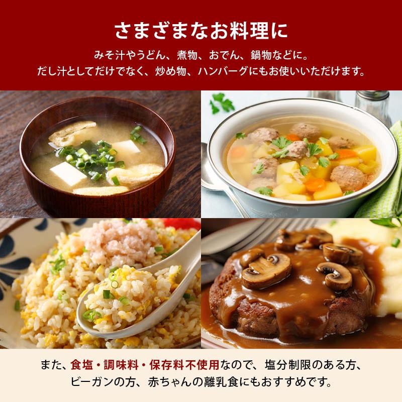 【さまざまなお料理に】みそ汁やうどん、煮物、おでん、鍋物などに。だし汁としてだけでなく、炒め物、ハンバーグにもお使いいただけます。また、食塩・調味料・保存料不使用なので、塩分制限のある方、ビーガンの方、赤ちゃんの離乳食にもおすすめです。