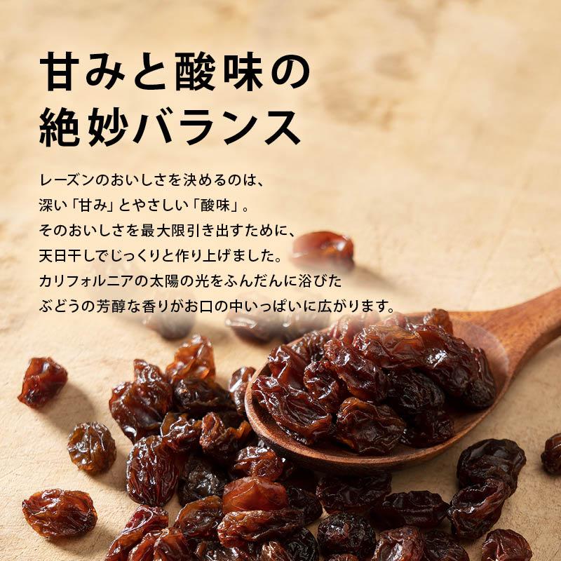 【甘みと酸味の絶妙バランス】レーズンのおいしさを決めるのは、深い「甘み」とやさしい「酸味」。そのおいしさを最大限引き出すために、天日干しでじっくりと作り上げました。カリフォルニアの太陽の光をふんだんに浴びたぶどうの芳醇な香りがお口の中いっぱいに広がります。