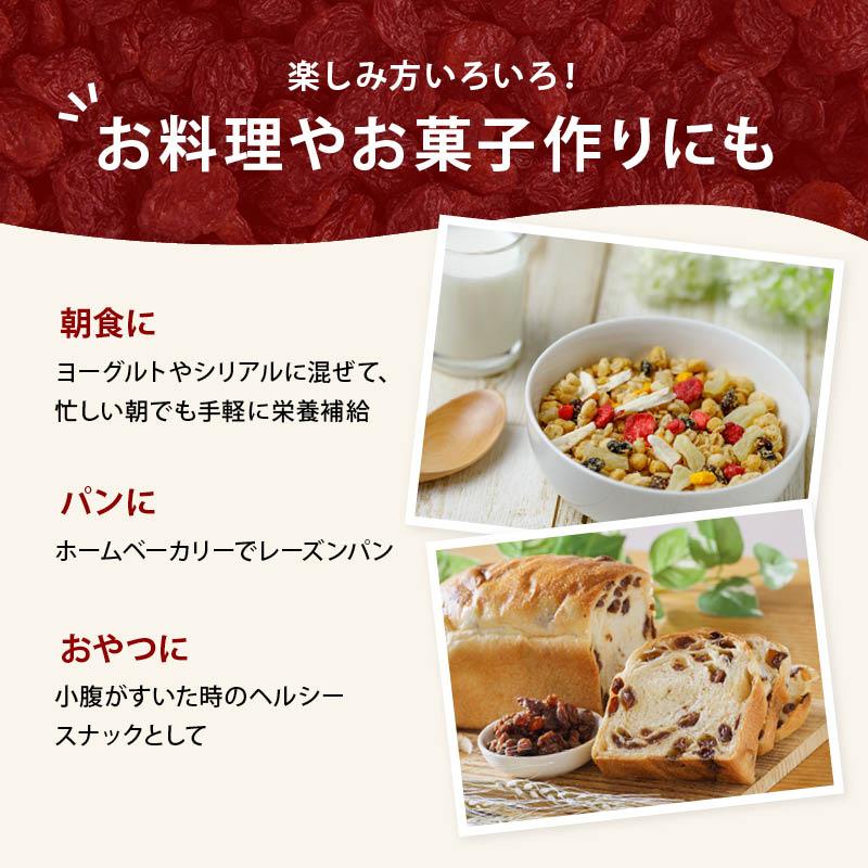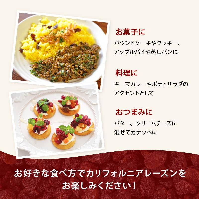 【お料理やお菓子作りにも】・朝食に:ヨーグルトやシリアルに混ぜて、忙しい朝でも手軽に栄養補給・パンに:ホームベーカリーでレーズンパン・おやつに:小腹がすいた時のヘルシースナックとして・お菓子に:パウンドケーキやクッキー、アップルパイや蒸しパンに・料理に:キーマカレーやポテトサラダのアクセントとして・おつまみに:バター、クリームチーズに混ぜてカナッペに