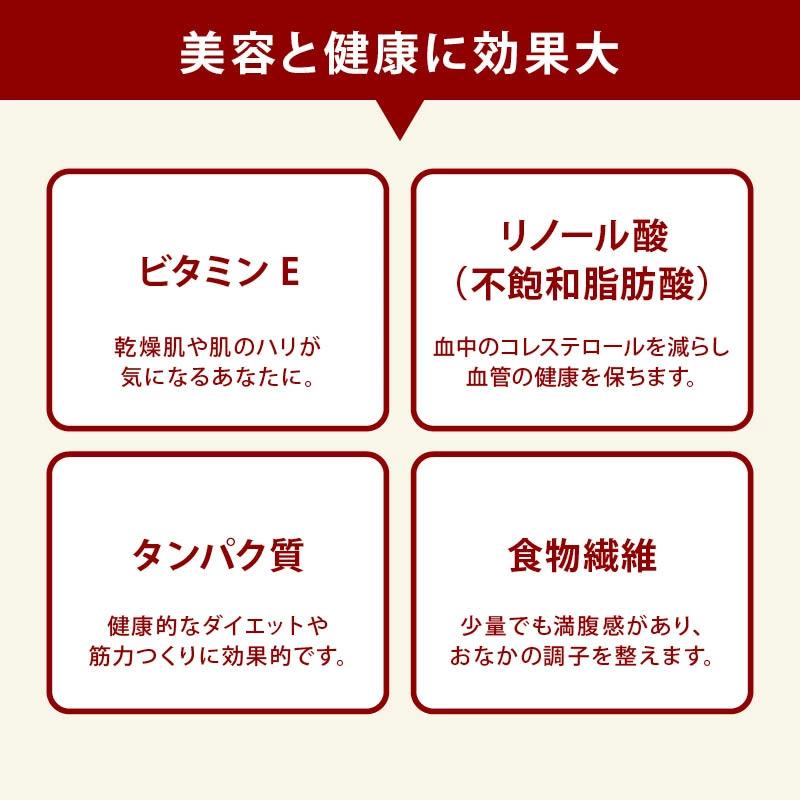 【美容と健康に効果大】ビタミンE:乾燥肌や肌のハリが気になるあなたに。リノール酸(不飽和脂肪酸):血中のコレステロールを減らし 血管の健康を保ちます。タンパク質:健康的なダイエットや筋力つくりに効果的です。食物繊維:少量でも満腹感があり、おなかの調子を整えます。