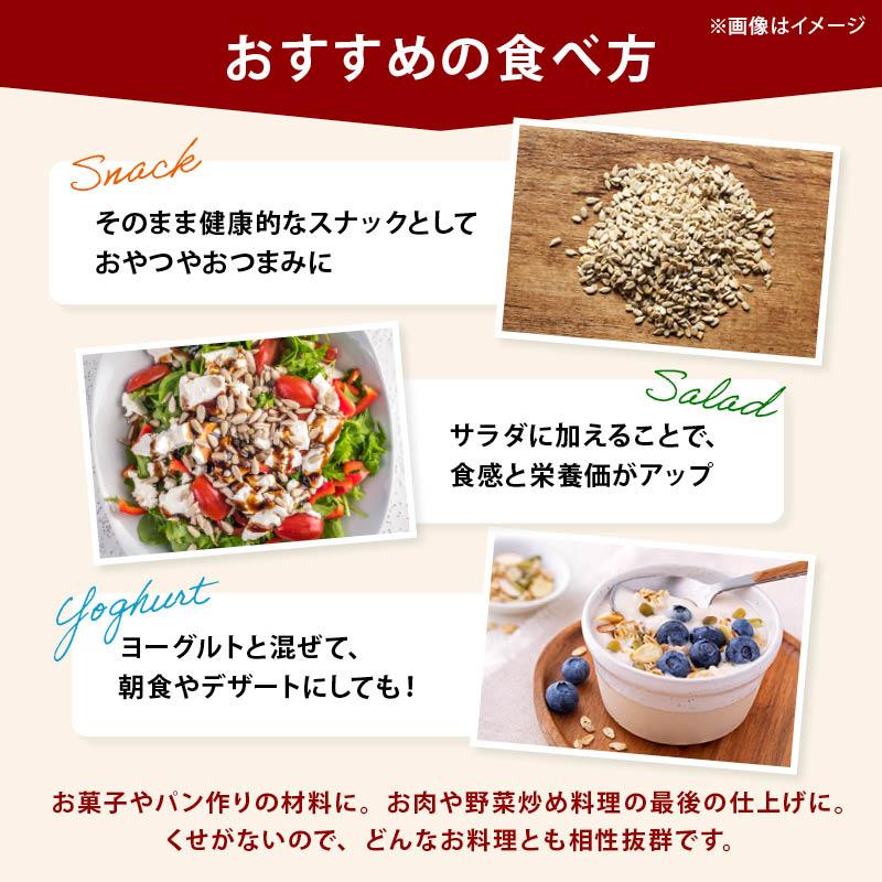 【おすすめの食べ方】そのまま健康的なスナックとして:おやつやおつまみに最適です。サラダのトッピング:サラダに加えることで、食感と栄養価がアップします。ヨーグルトに混ぜて:朝食やデザートにピッタリです。そのほかにもお菓子やパン作りの材料としてお肉や野菜炒め料理の最後にパッと混ぜ合わせてくせがないので、どんなお料理とも相性抜群です。
