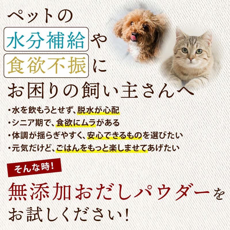 【シーンで選べる活用法】水分補給に:水やぬるま湯に溶かすだけごはんの風味づけに:ふりかけ感覚で少量だけふやかす際の風味付けに:だしスープをいつものフードにかけて手作りご飯に:旨みと風味がアップ