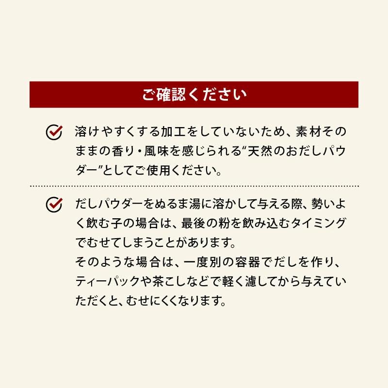 (ご確認ください)溶けやすくする加工をしていないため、素材そのままの香り・風味を感じられる“天然のおだしパウダー”としてご使用ください。だしパウダーをぬるま湯に溶かして与える際、勢いよく飲む子の場合は、最後の粉を飲み込むタイミングでむせてしまうことがあります。そのような場合は、一度別の容器でだしを作り、ティーパックや茶こしなどで軽く濾してから与えていただくと、むせにくくなります。