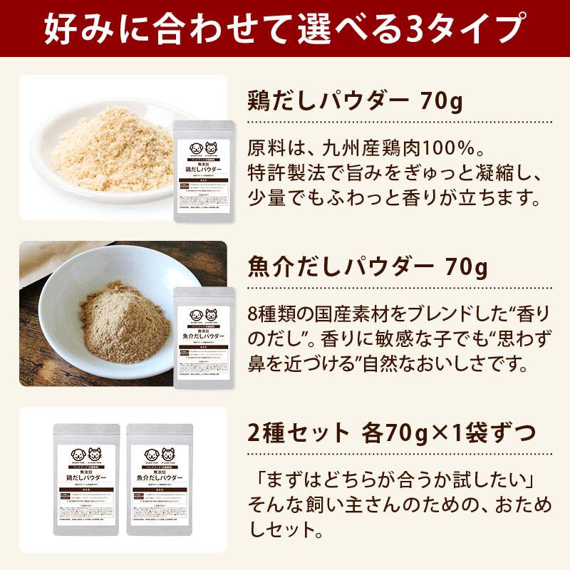 ◆2種セット 各70gx1袋づつ(計2袋)「まずはどちらが合うか試したい」そんな飼い主さんのための、おためしセット。鶏のやさしい旨み・魚介の香ばしい風味。愛犬・愛猫の反応を見ながら、ぴったりのタイプを選べます。