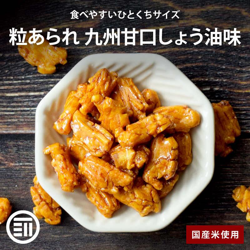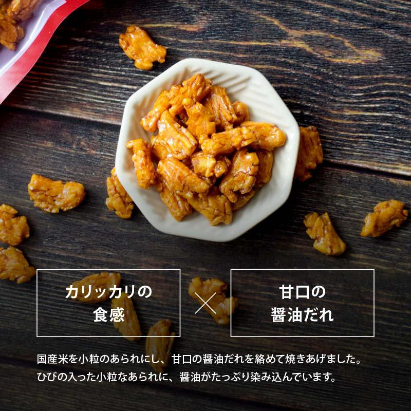 -粒あられの特長-やみつきの甘口醤油味、カリッカリの食感、食べやすい一口サイズ!一度手を出してしまうと、あっという間に食べてしまうようなクセになるおいしさです。こだわりの国産米使用。