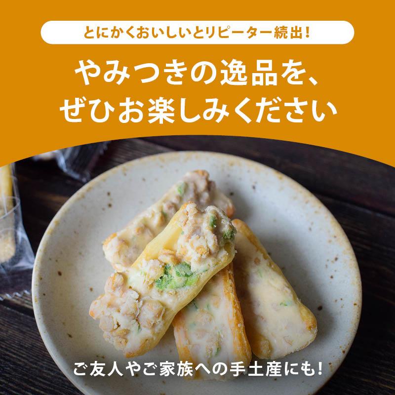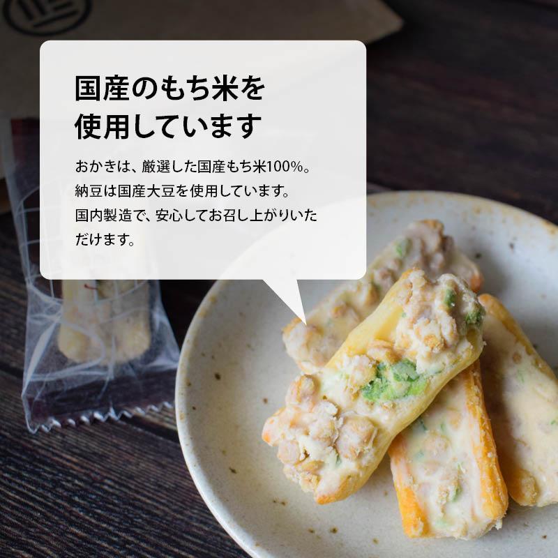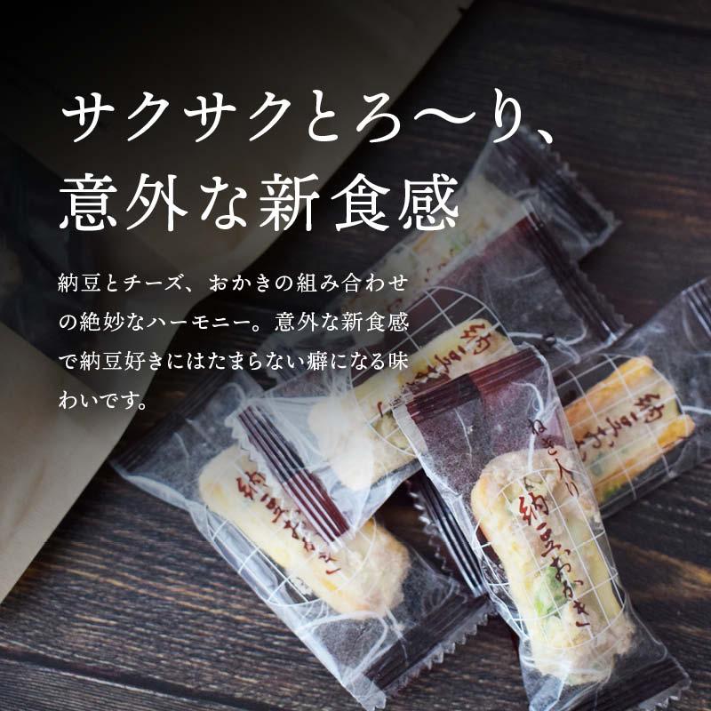 納豆とチーズ、おかきの組み合わせがたまらない「納豆チーズおかき」。お茶請けやおやつ、お土産にもおすすめです。やみつきの逸品を、ぜひお楽しみください。