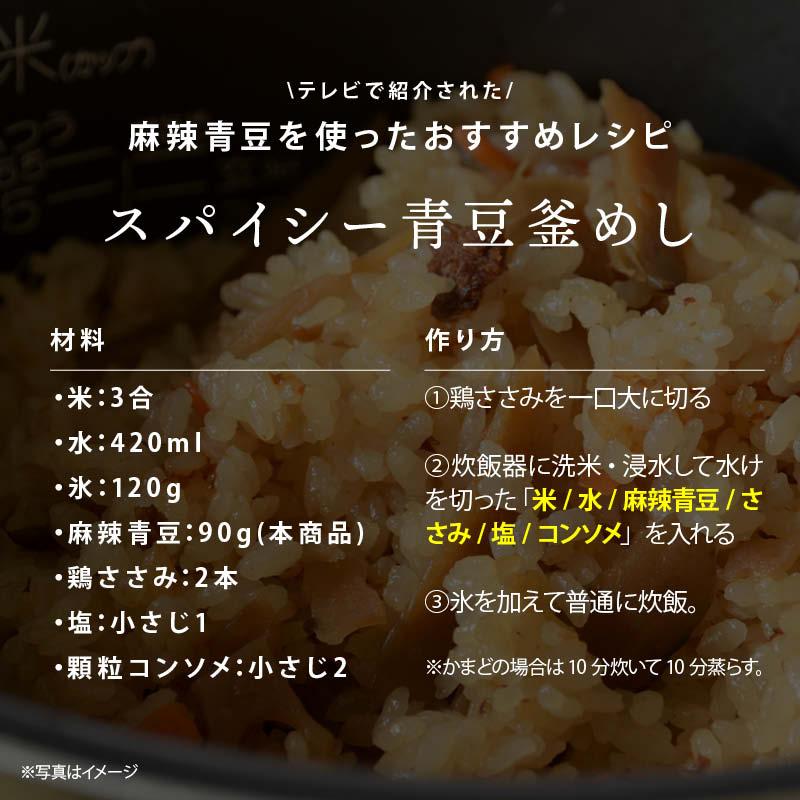 山椒の『麻(痺れ)』と唐辛子の『辣(辛味)』で麻辣青豆。ひとつ食べてみると、塩っけのあとに旨味を、そして唐辛子の辛さ、青ピースの香ばしさ。最後に花椒(ホアジャオ)の爽やかなシビレをしっかりと感じます。赤唐辛子で辛さ、花椒(ホアジャオ)で痺れる辛さ、ピリっとしつつもシビレる辛さを実現しました。青ピースだからこそ完成した麻辣のバランスをぜひ。よく冷えたビール、またはすっきりした炭酸飲料とお召し上がり下さい。塩っけがあって辛く、食べたあとは爽やかなシビレが残るので、キリッとした炭酸との相性抜群です。サクサクとした食感とやみつきになる爽やかな辛さで、夏場にぴったりの一品です。※癖になるおいしさの為、食べ過ぎると口の中が麻痺状態になります。ご注意を。
