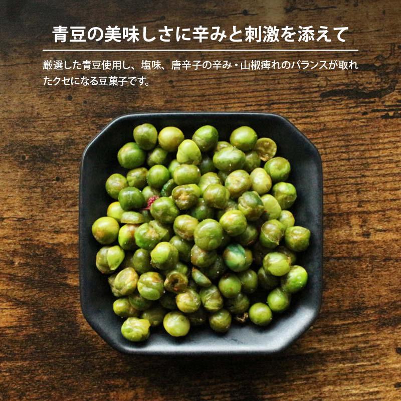 厳選青豆、塩味、唐辛子の辛み、山椒の痺れがクセになる豆菓子。山椒の痺れる辛さと唐辛子のピリっとした辛さが美味しいやみつきになる逸品。暑い日の冷えたビールのおつまみにぜひ。